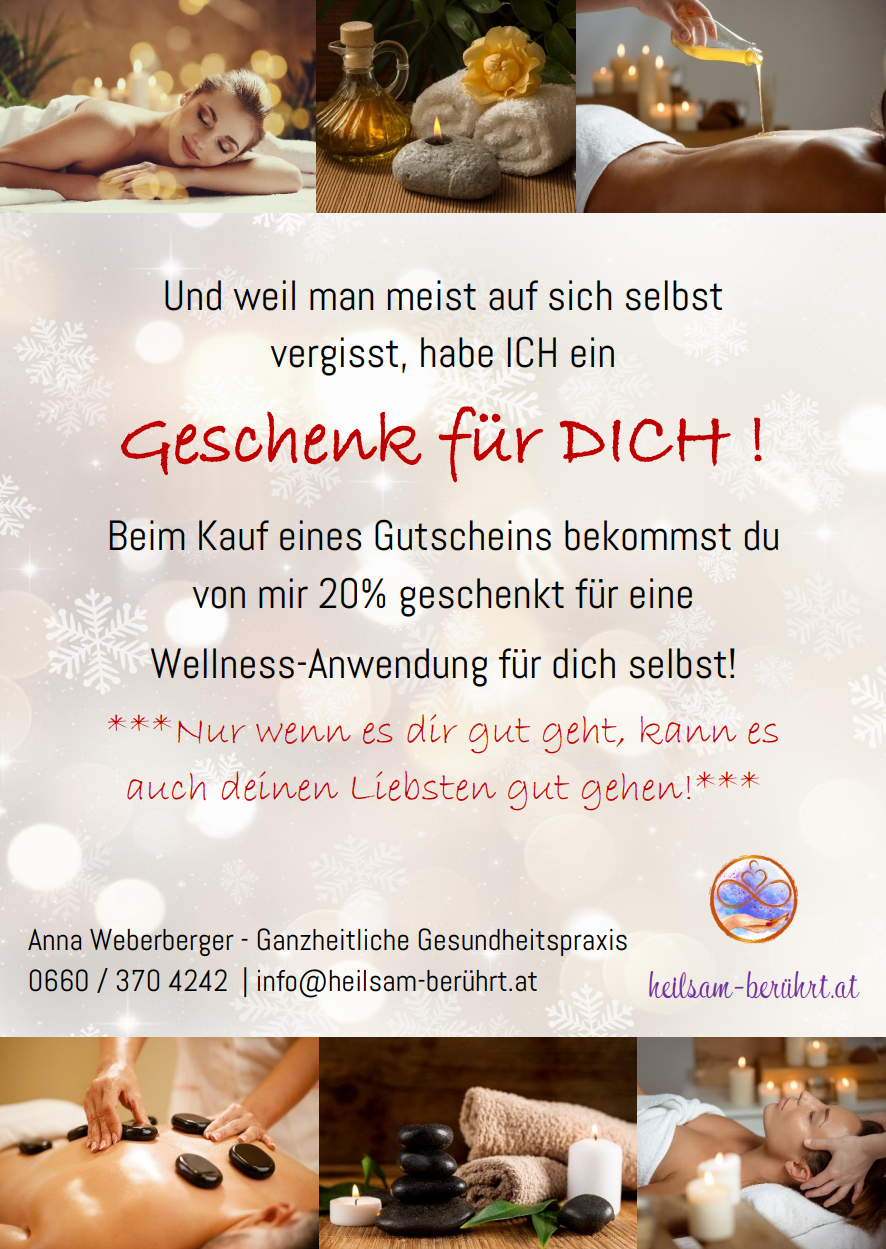 Aktionsbedingungen: Aktion gültig bis 23. Dezember 2025. Pro Person ist nur ein Rabatt-Gutschein auf Wellness-Anwendungen erhältlich. Es werden 20 % vom Preis der Wellness-Anwendung, jedoch höchstens 20 % des gekauften Wertgutscheins von der Wellness-Anwendung abgezogen.