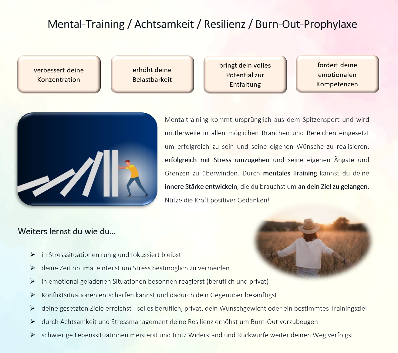 Resilienz ist erlernbar! Durch unterschiedliche Techniken kann man lernen, resilient zu werden und nach Rückschlägen des Lebens wieder vorwärts zu schreiten. Durch den liebevollen und achtsamen Umgang mit sich selbst und den Fokus darauf, mit Stress gesund umzugehen, lässt sich ein Burnout weitgehend vermeiden.
